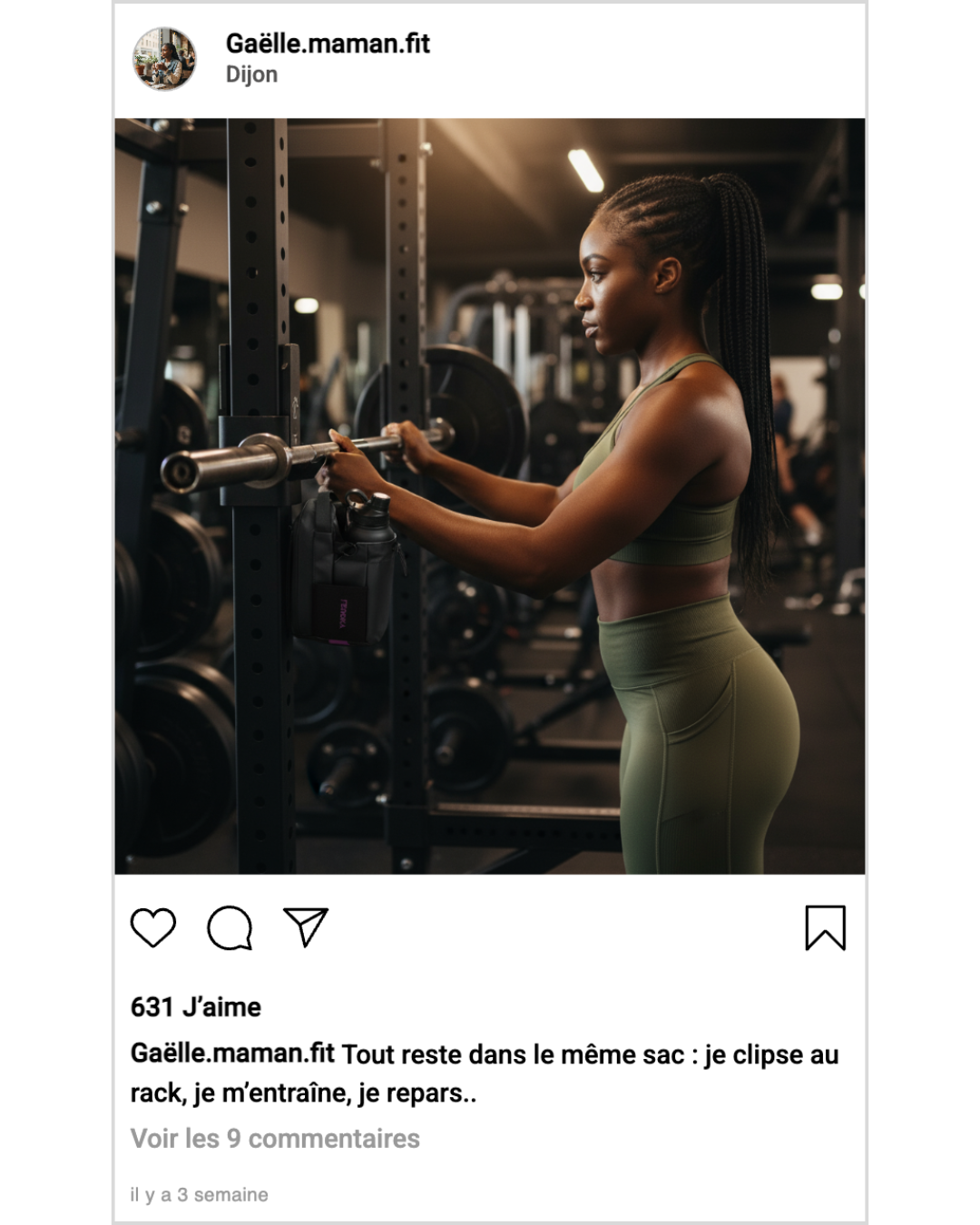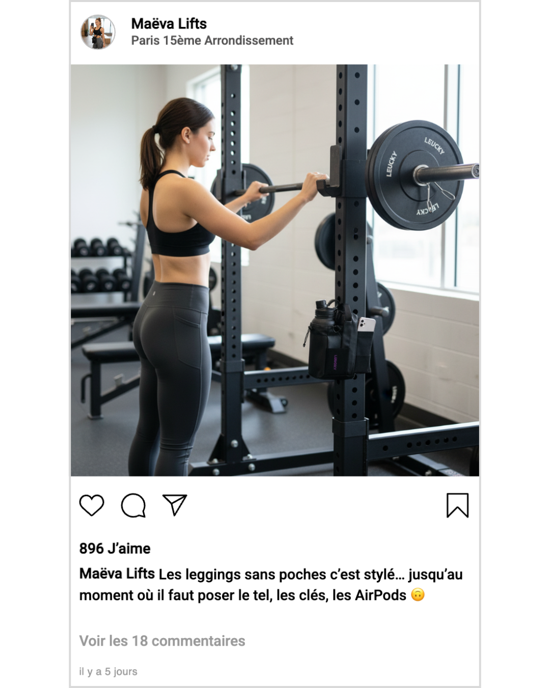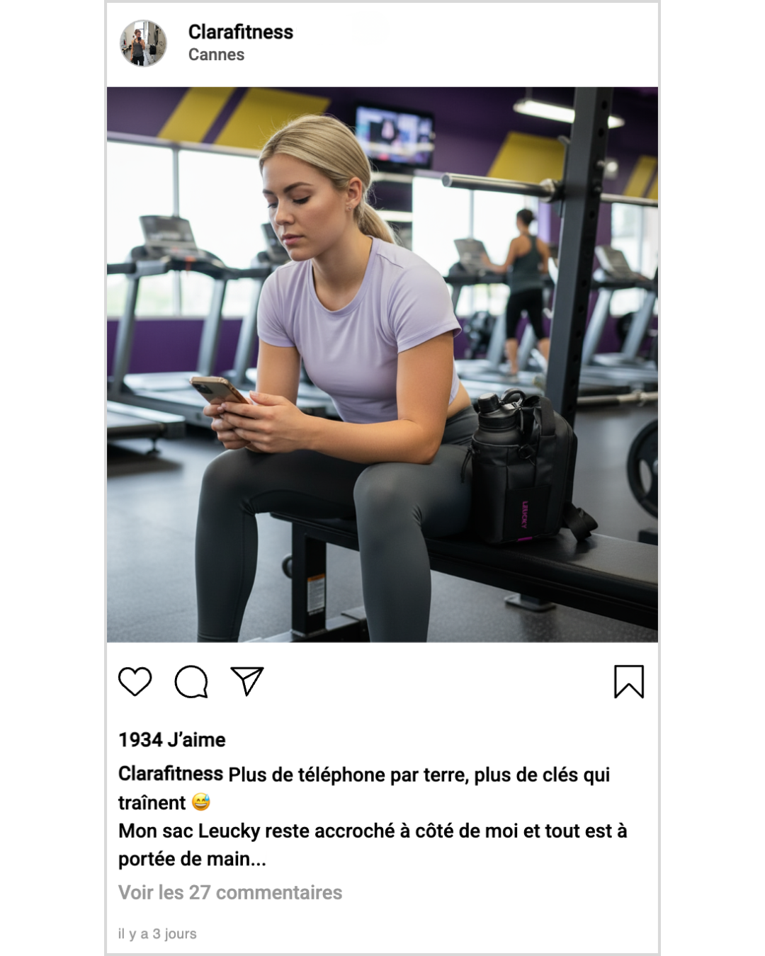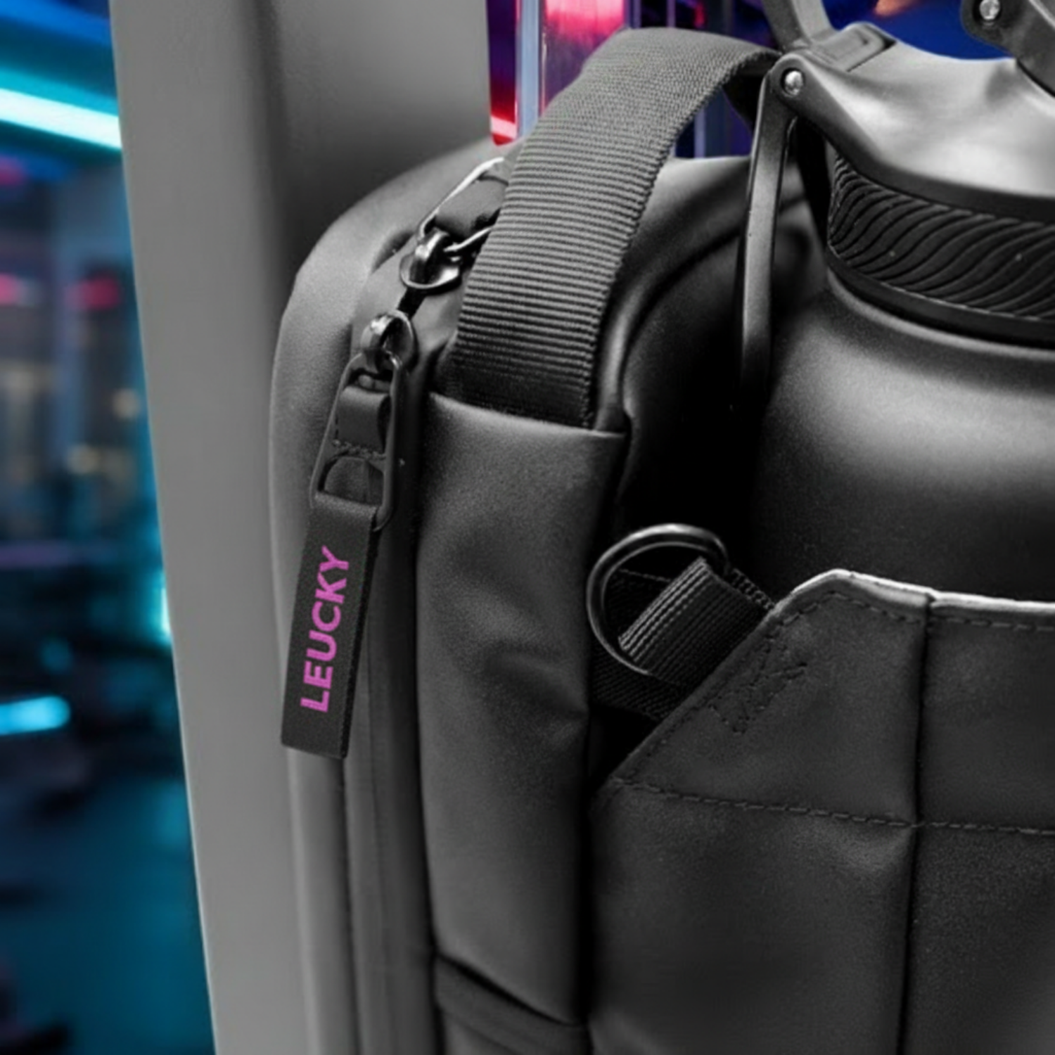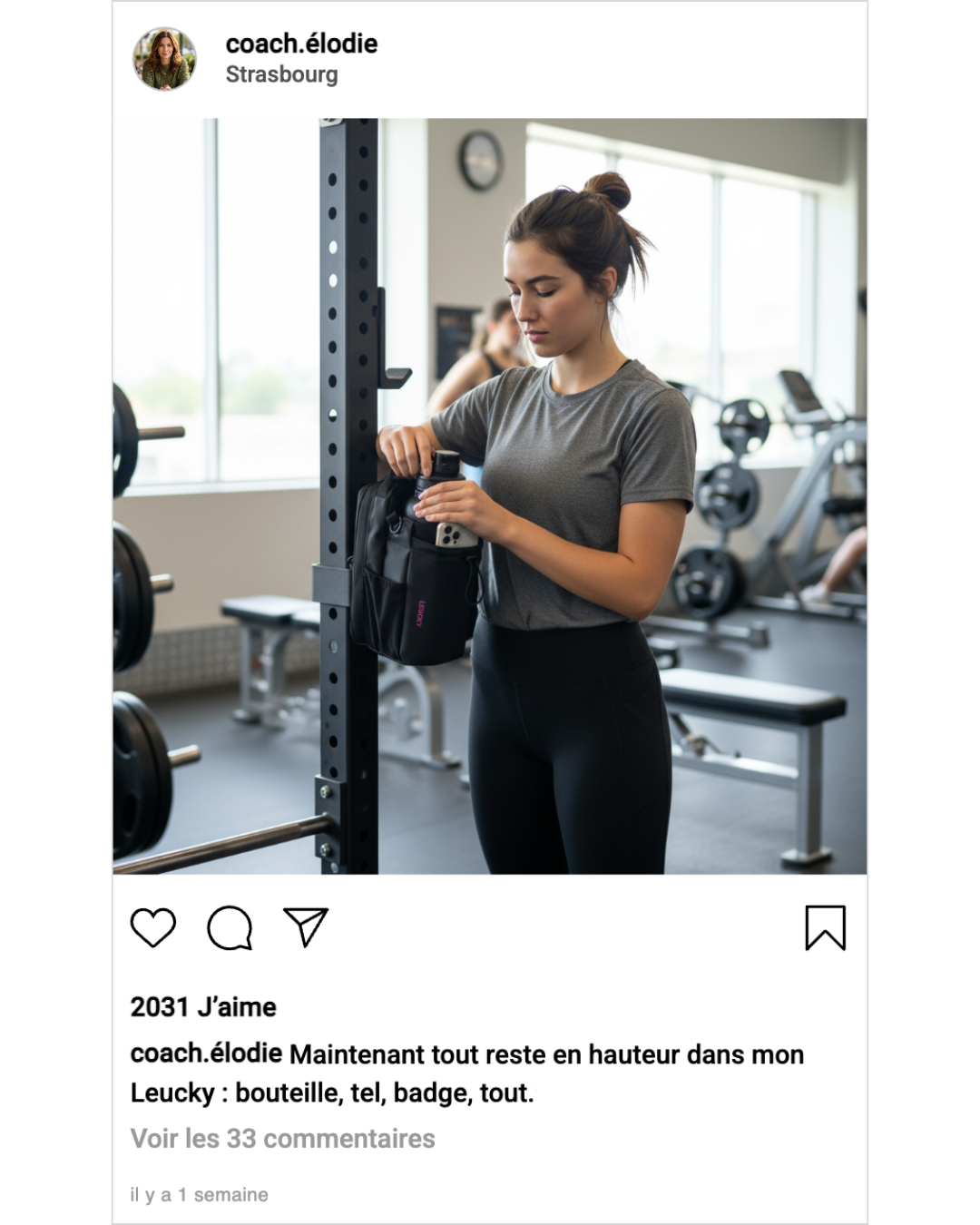 Fini de déplacer vos affaires de machine en machine, Leucky regroupe vos essentiels dans un seul sac accroché à hauteur de main, pour des séances plus fluides et moins fatigantes.
